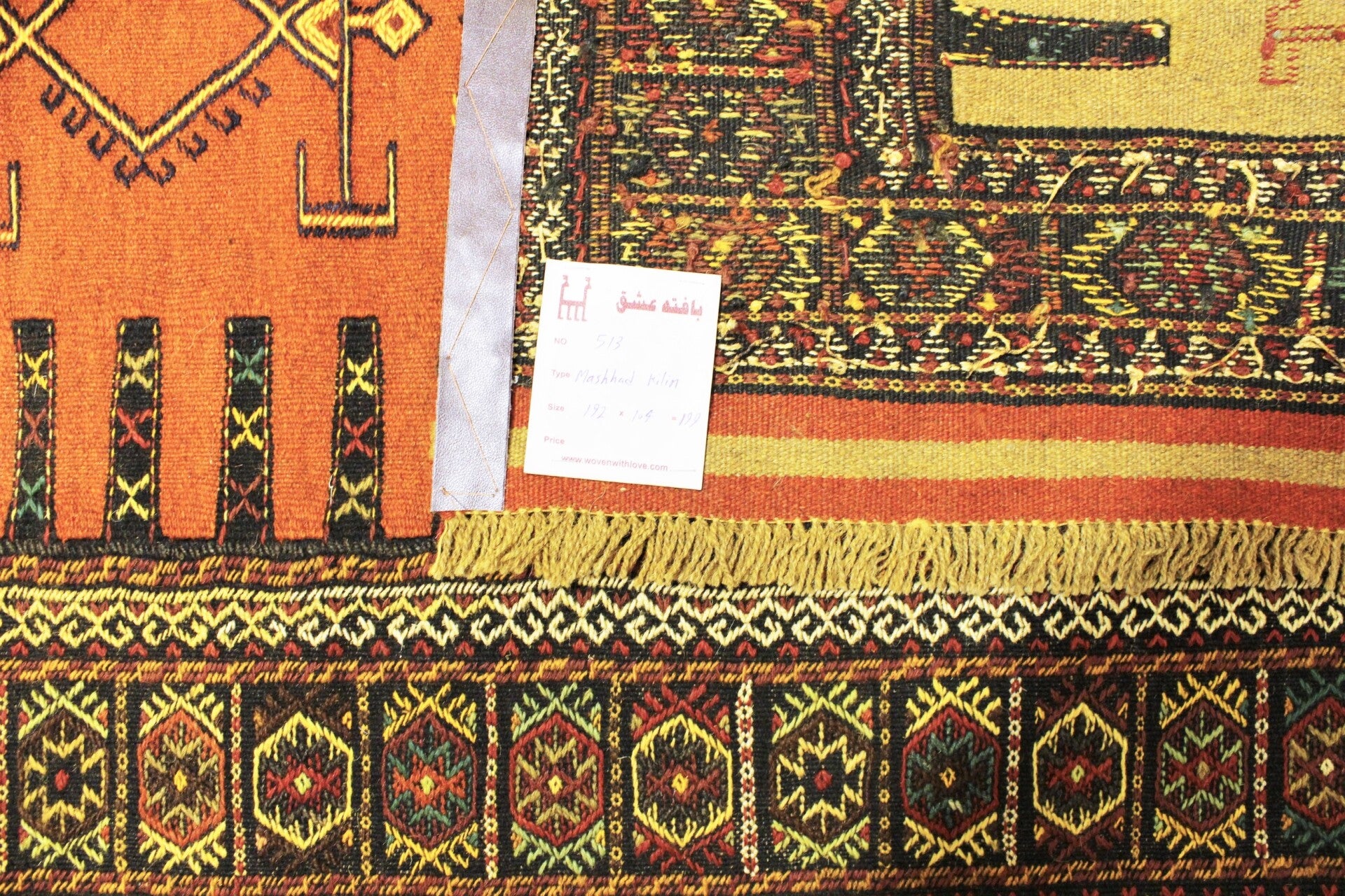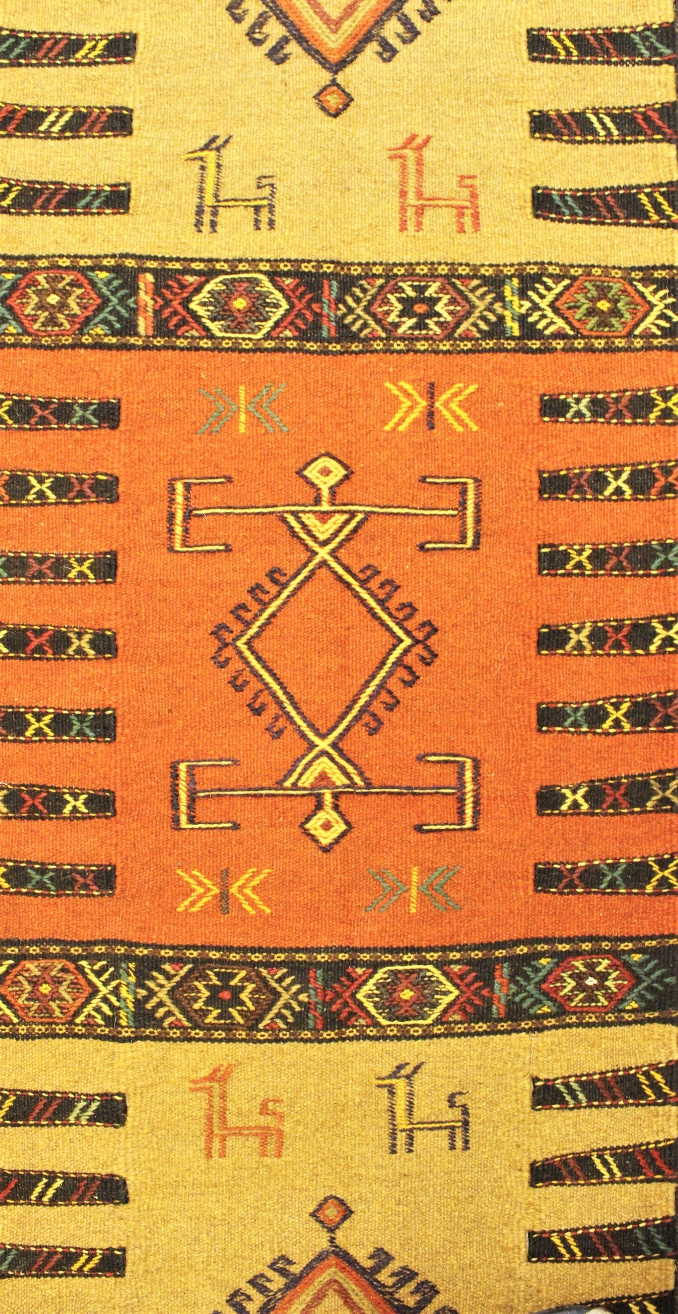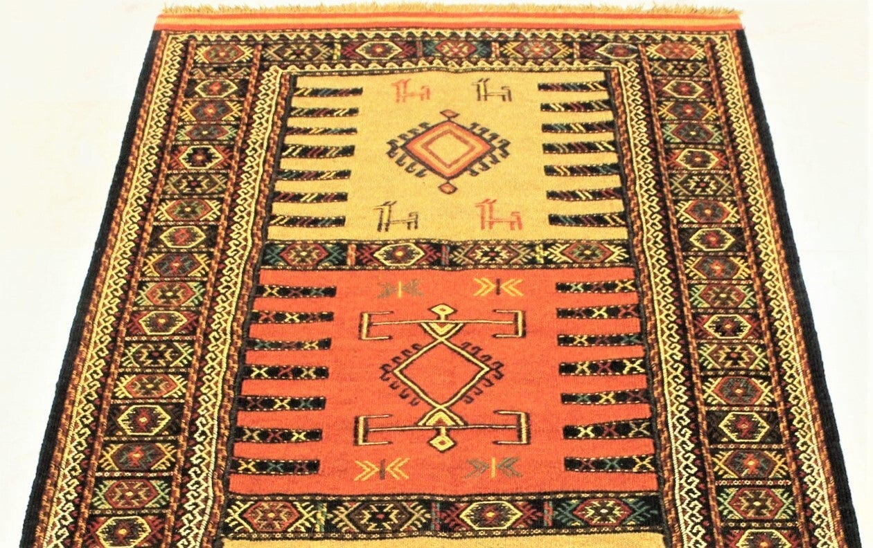 Der Sumak-Kelim ist NEU, wird jedoch nach der Fertigstellung fachgerecht gewaschen, da es sich um ein handgewebtes Stück handelt.