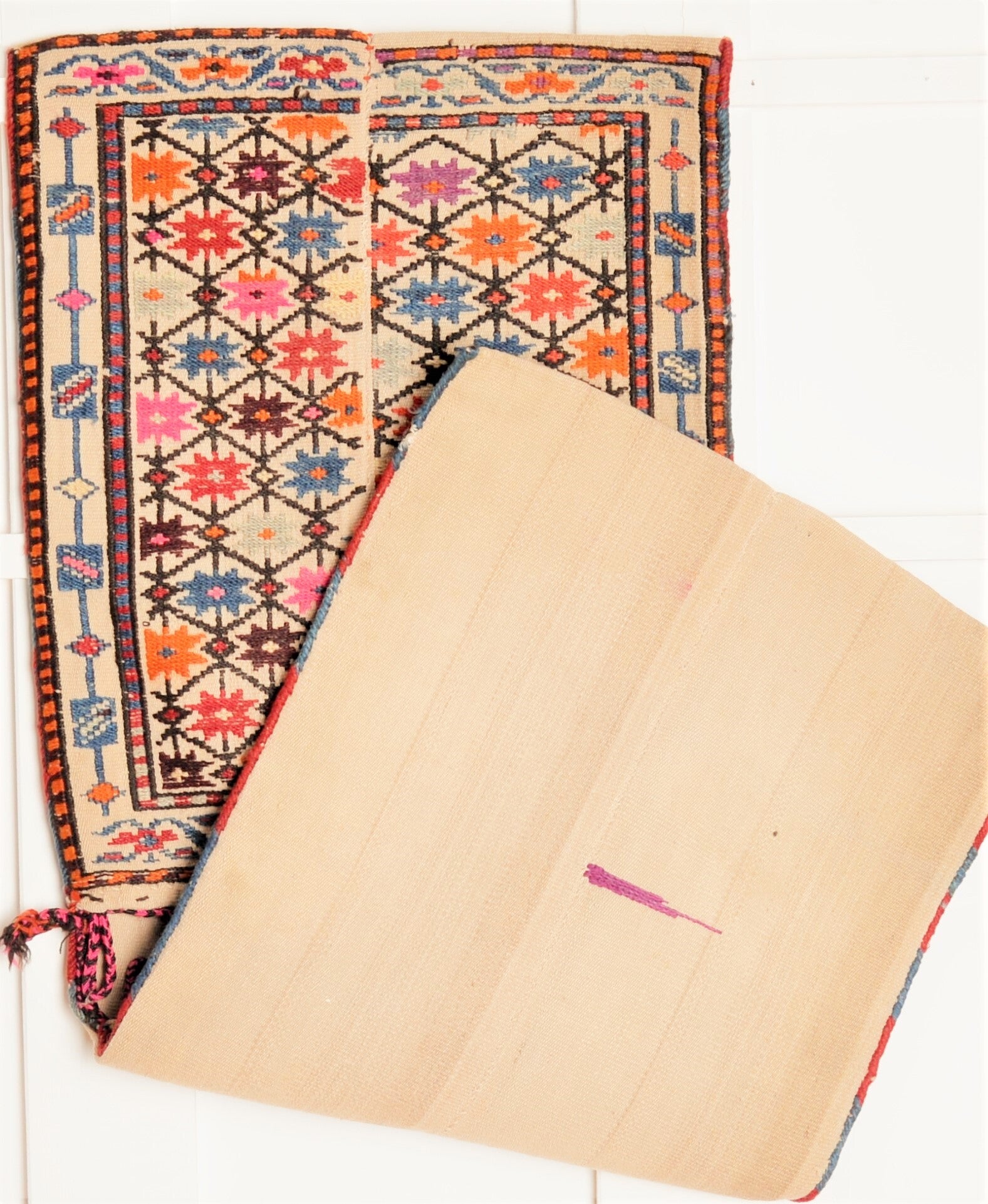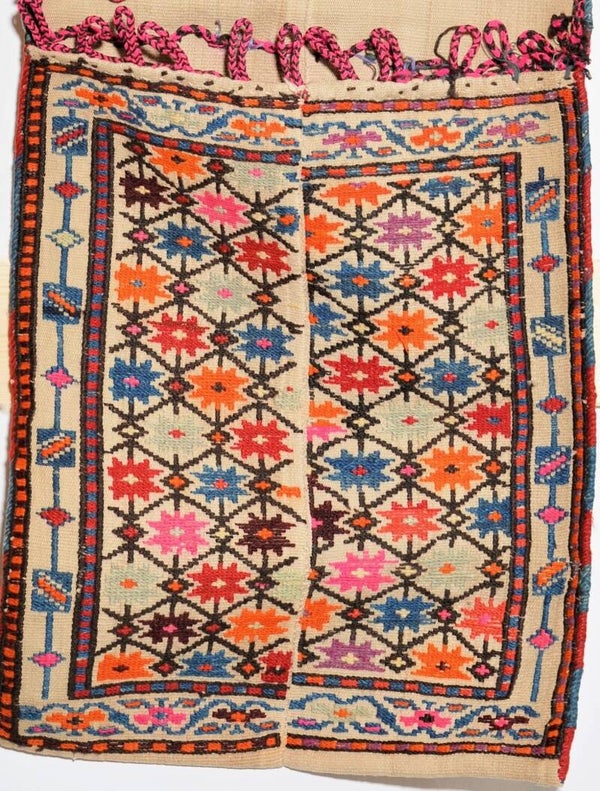 Diese Satteltasche wurde um 1960 von den Shahsavan-Nomaden in Nordpersien für den Eigenbedarf gefertigt. Sie gehört zur traditionellen Kelim Shilaki Webkunst und kommt