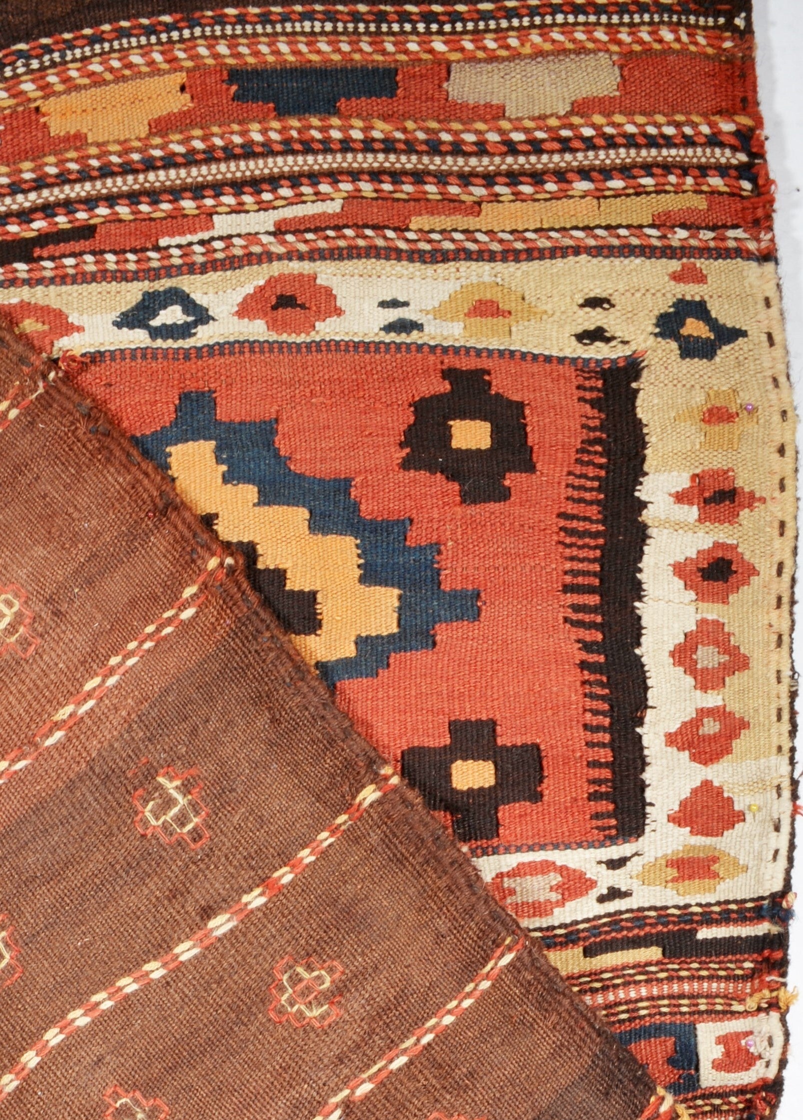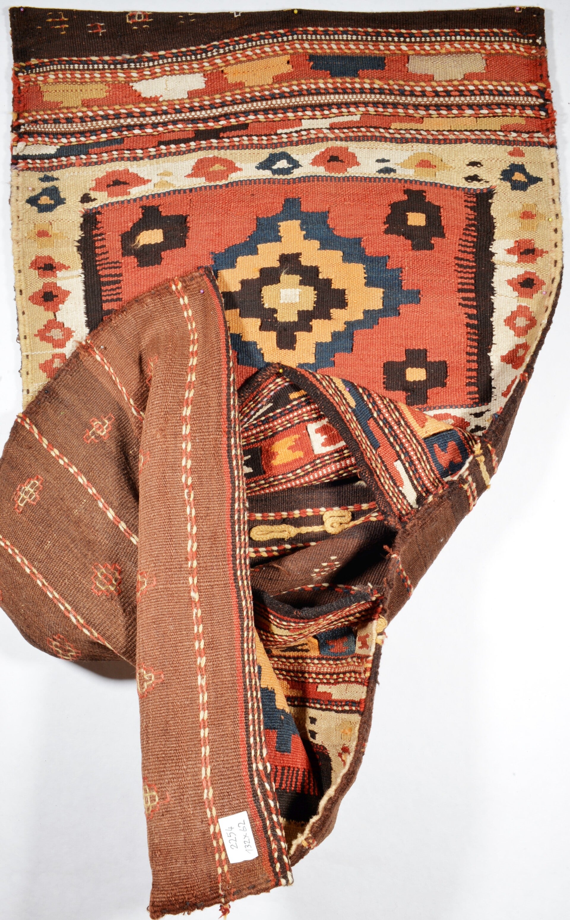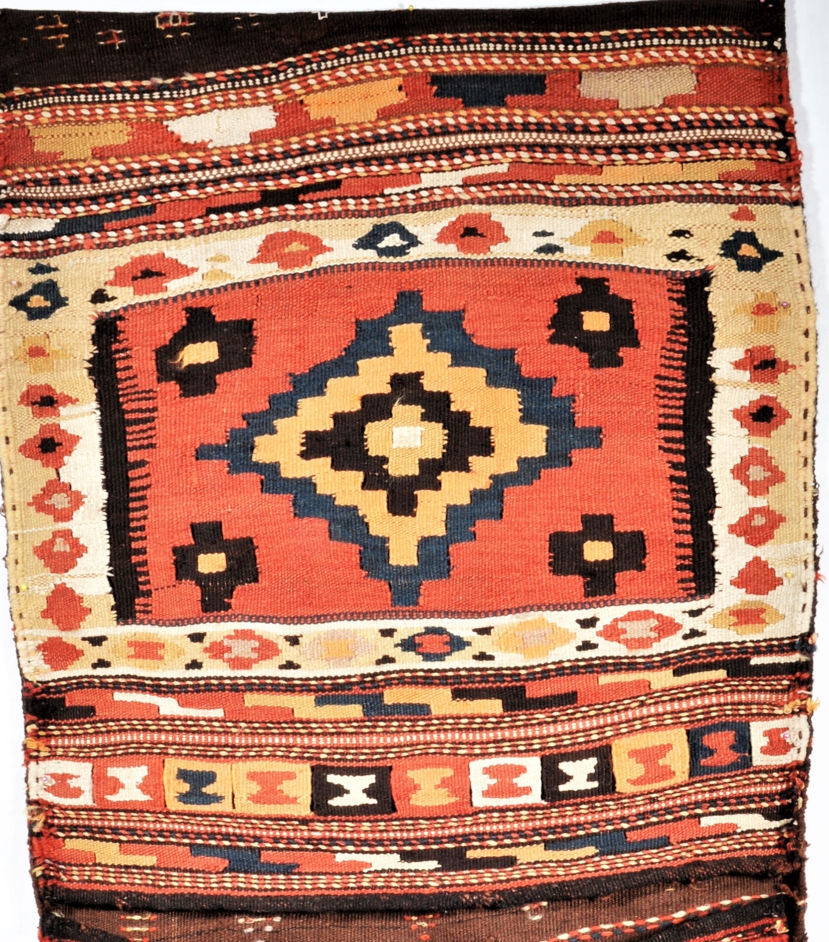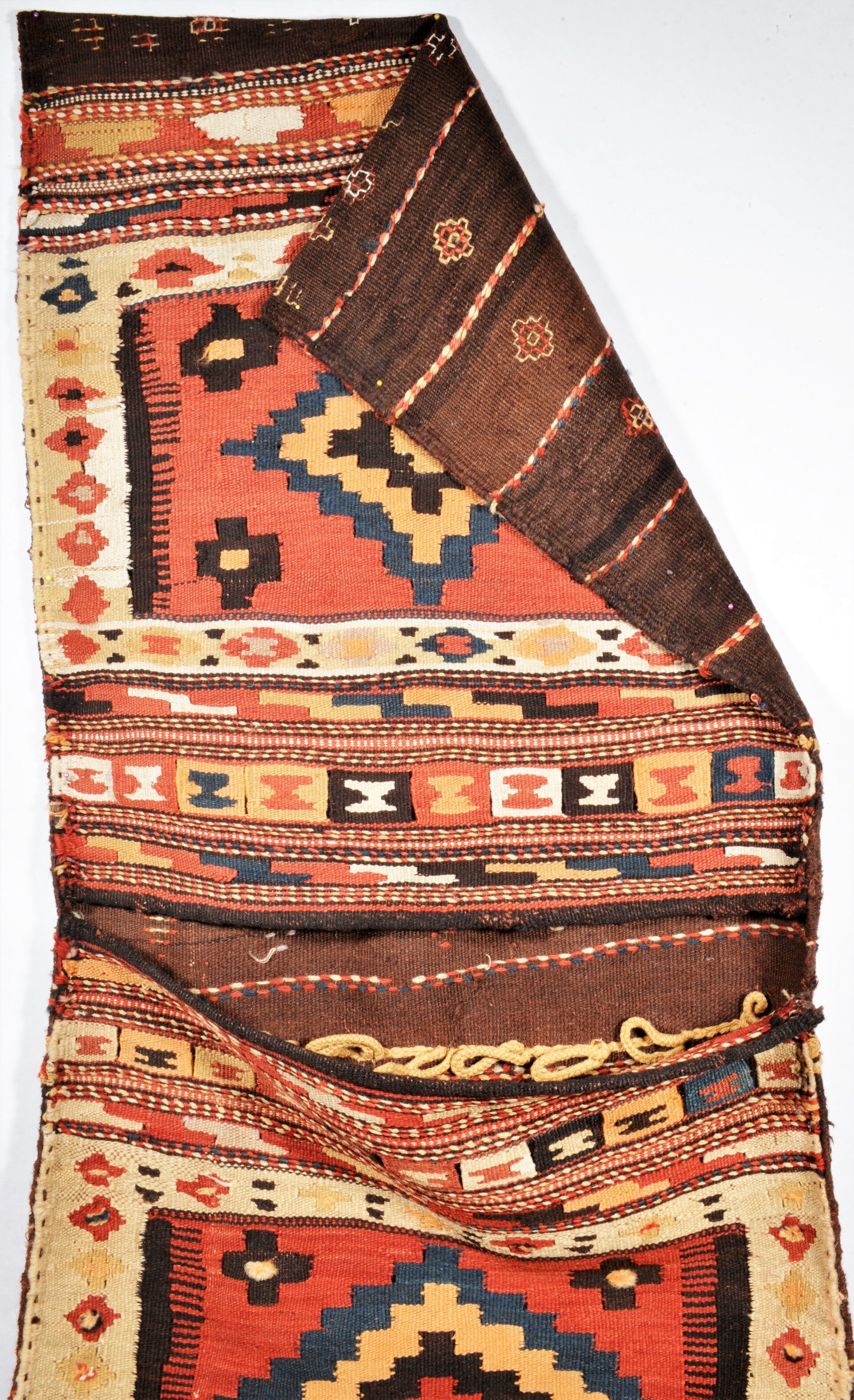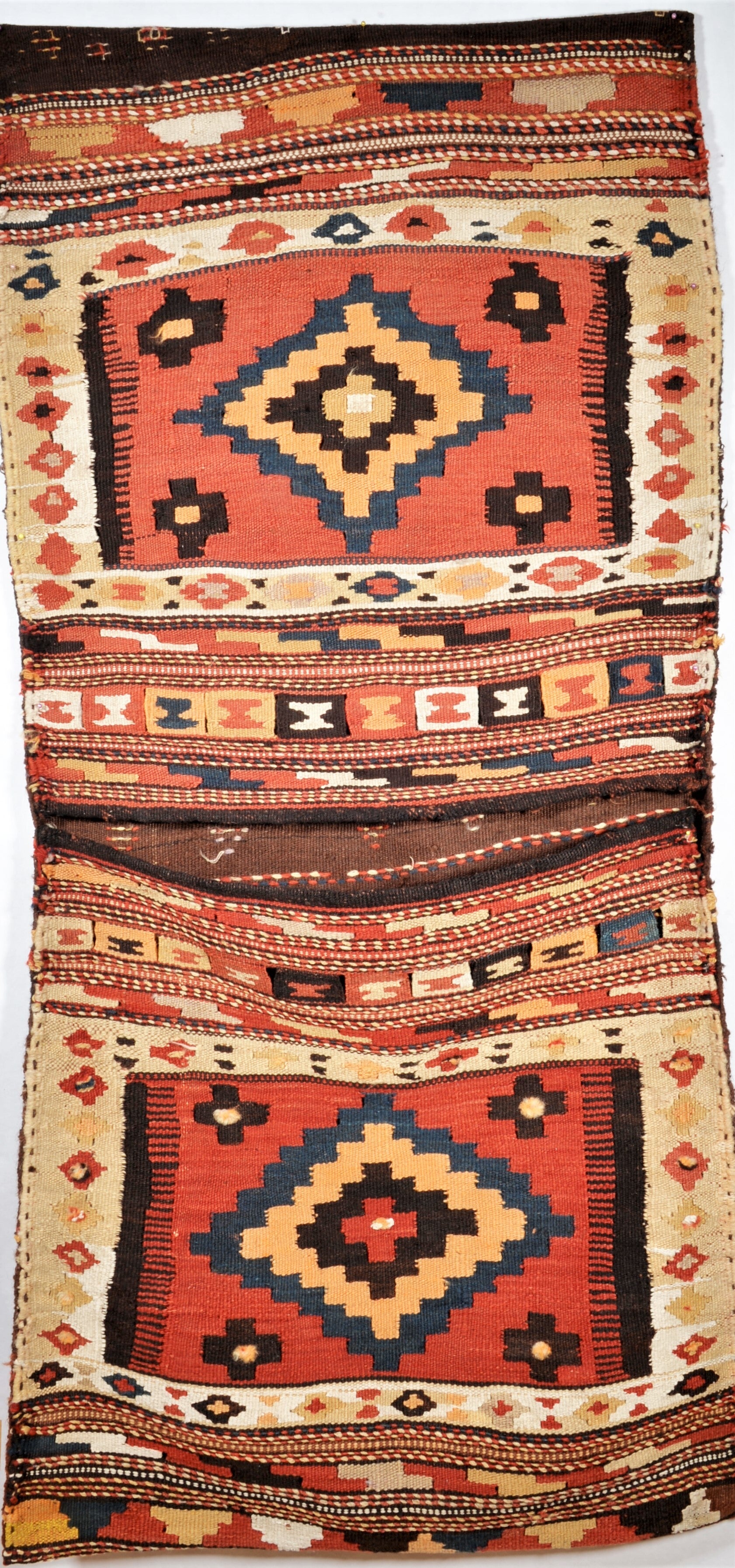 Diese Satteltasche wurde um 1960 von den Nomaden in Semnan-Gebiet für den Eigenbedarf gefertigt. Sie gehört zur traditionellen Kelim Webkunst und kommt mit einem